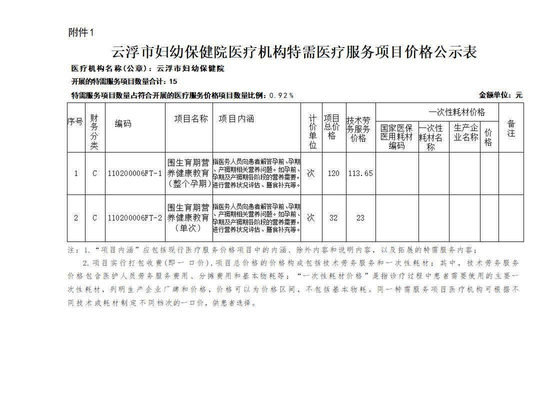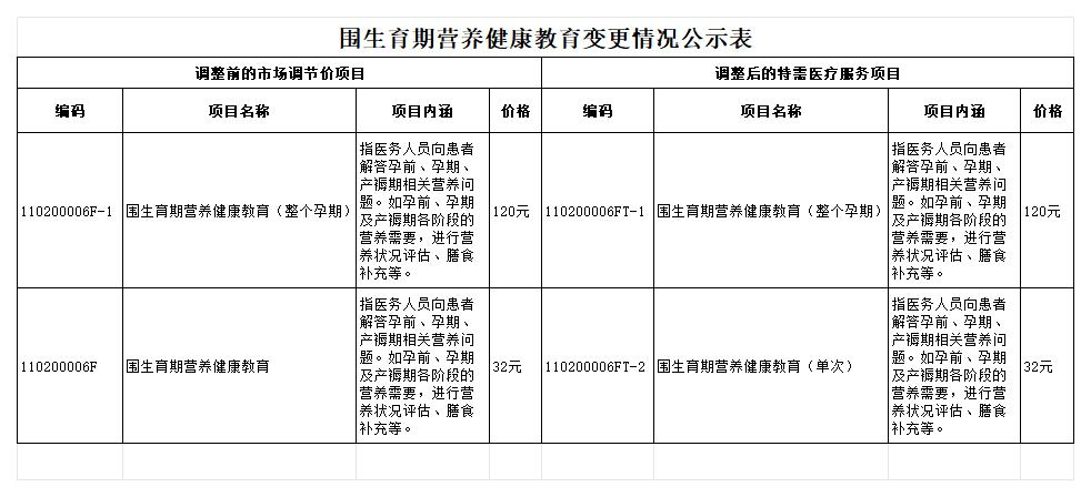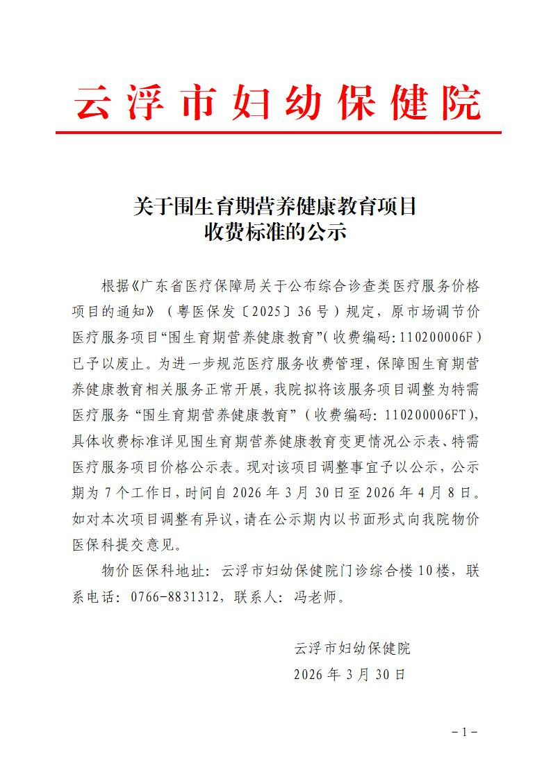 关于围生育期营养健康教育项目收费标准的公示