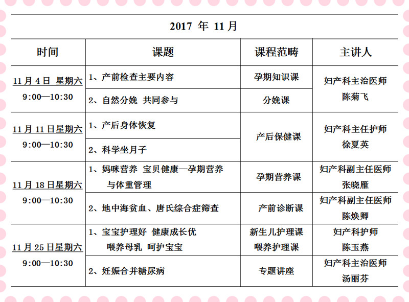 【孕妇学校】云浮市妇幼保健院孕妇学校11月份课程安排