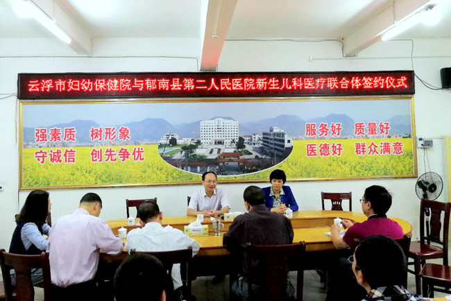 2017年11月15日下午,云浮市妇幼保健院与郁南县第二人民医院签订《新生儿科专科联盟合作协议书》,组建新生儿科专科联盟,实现新生儿科专科上下转诊,横向盘活现有医疗资源,形成补位发展模式。